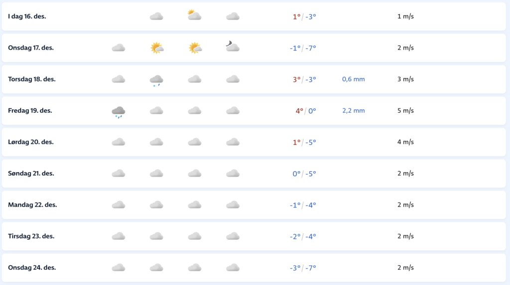 Det er plussgrader i dag, og det varsles noen små plussgrader tre av de neste åtte dagene. Værmeldingen for de samme dagene er fri for snøfall. Den varslede minimumstemperaturen i perioden er -7 grader i morgen ettermiddag.